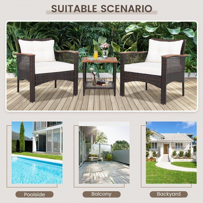 Including two back cushions and two seat cushions, this rattan set will offer you a comfortable sitting experience. The wide sitting area with ergonomic armrests and backrest will quickly get rid of your tiredness. Moreover, the seat cushion cover with zippers is simple to remove and maintain. The main frame is made of heavy-duty steel, which is rustproof and anti-deformation. The bottom X-shaped structure of sofas and adjustable footpads on the front sofa legs highly improve the stability. Both the armrests and tabletop are made of premium acacia wood, which is sturdy and durable, too. The main bodies of 3 pieces are wrapped with weatherproof PE rattan, ensuring long-lasting outdoor use. All in all, this 3-piece patio rattan sofa set is perfect for you to relax outdoors.