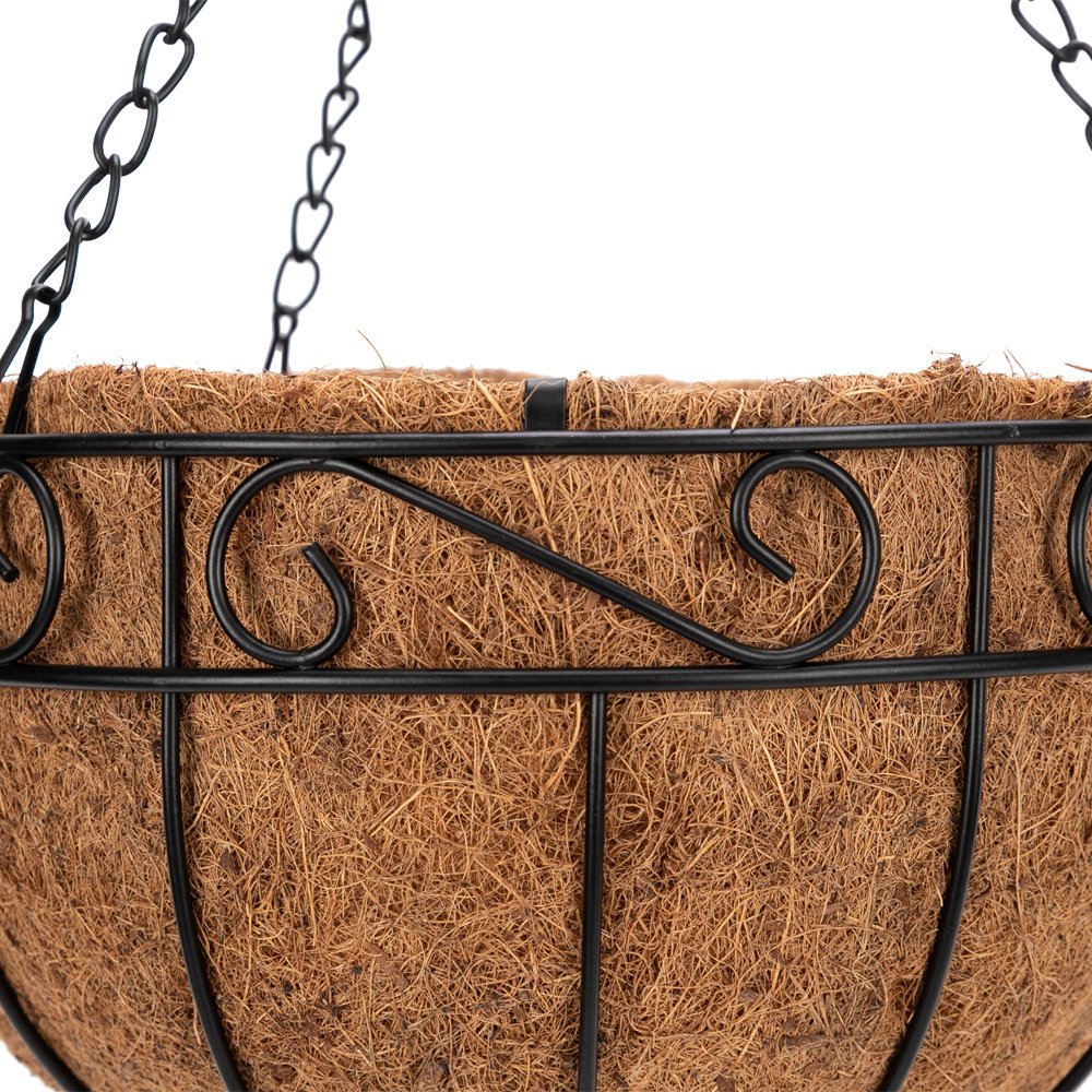 Sturdy round hanging grower basket constructed of strong steel rod with a tough black vinyl coating for long-life. Attached to basket for trouble free hanging are: a black vinyl coated hook and three heavy-duty black vinyl coated steel chains. A per-formed coco liner is conveniently attached to basket for easy filling.