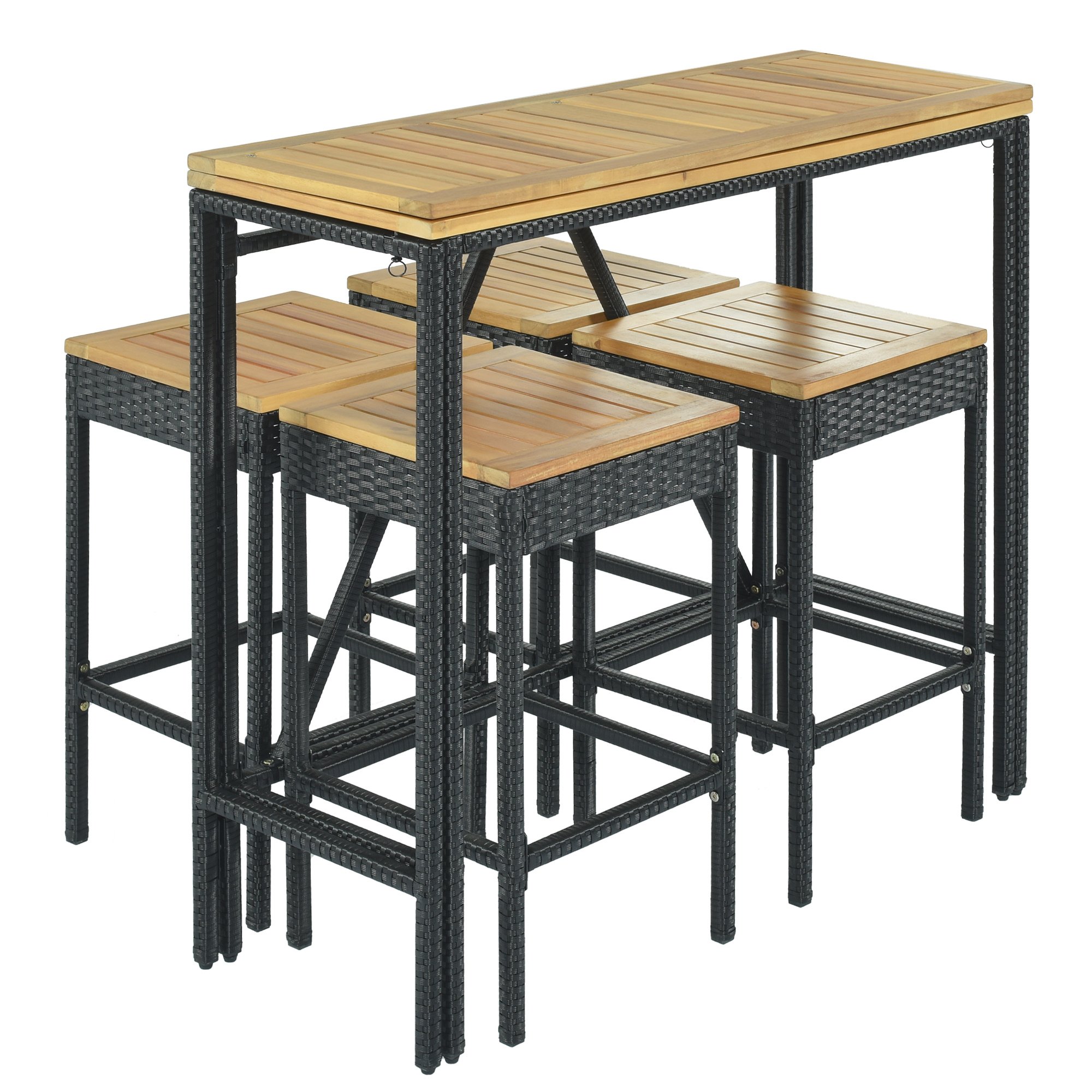 5-Piece Outdoor Patio Wicker Bar Set; Garden PE Rattan Wicker Dining Table; Square Stool Set; Foldable Tabletop; Acacia Wood Tabletop; High-Dinin