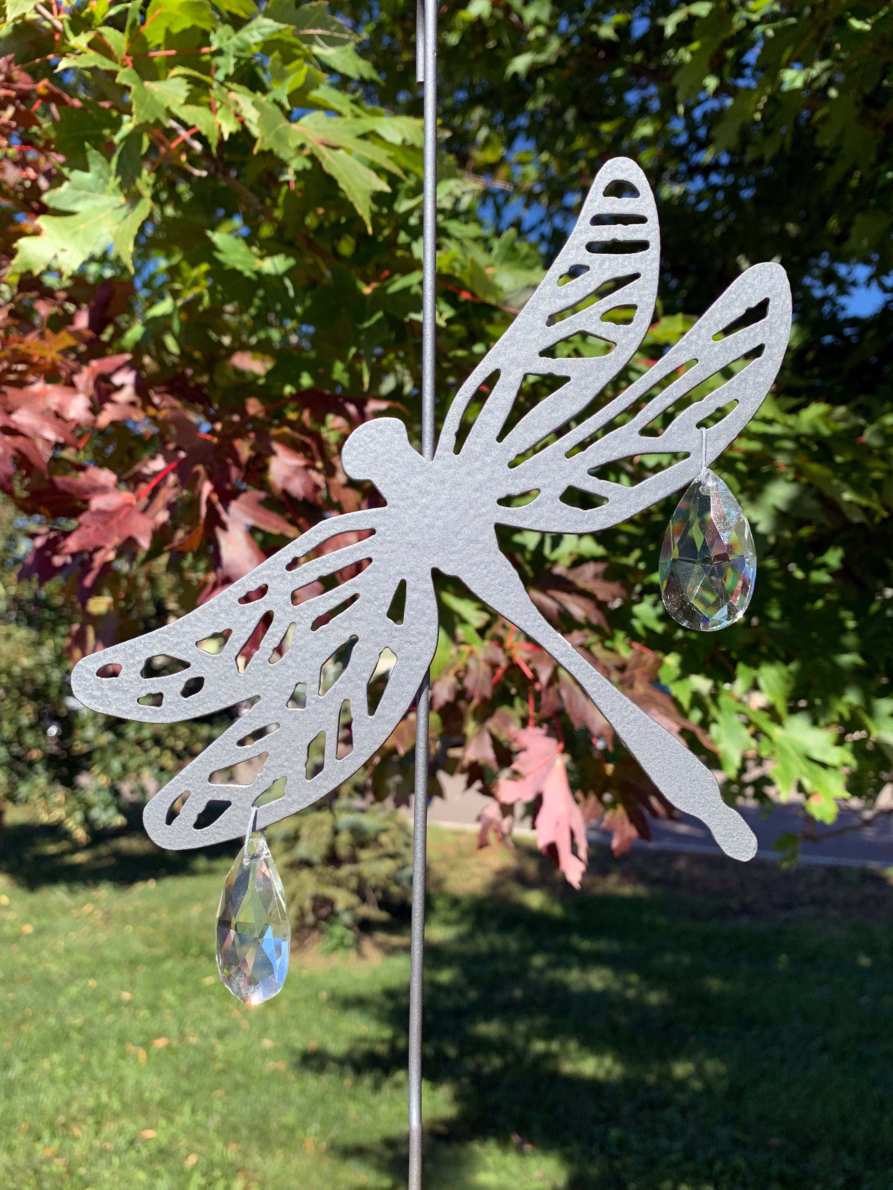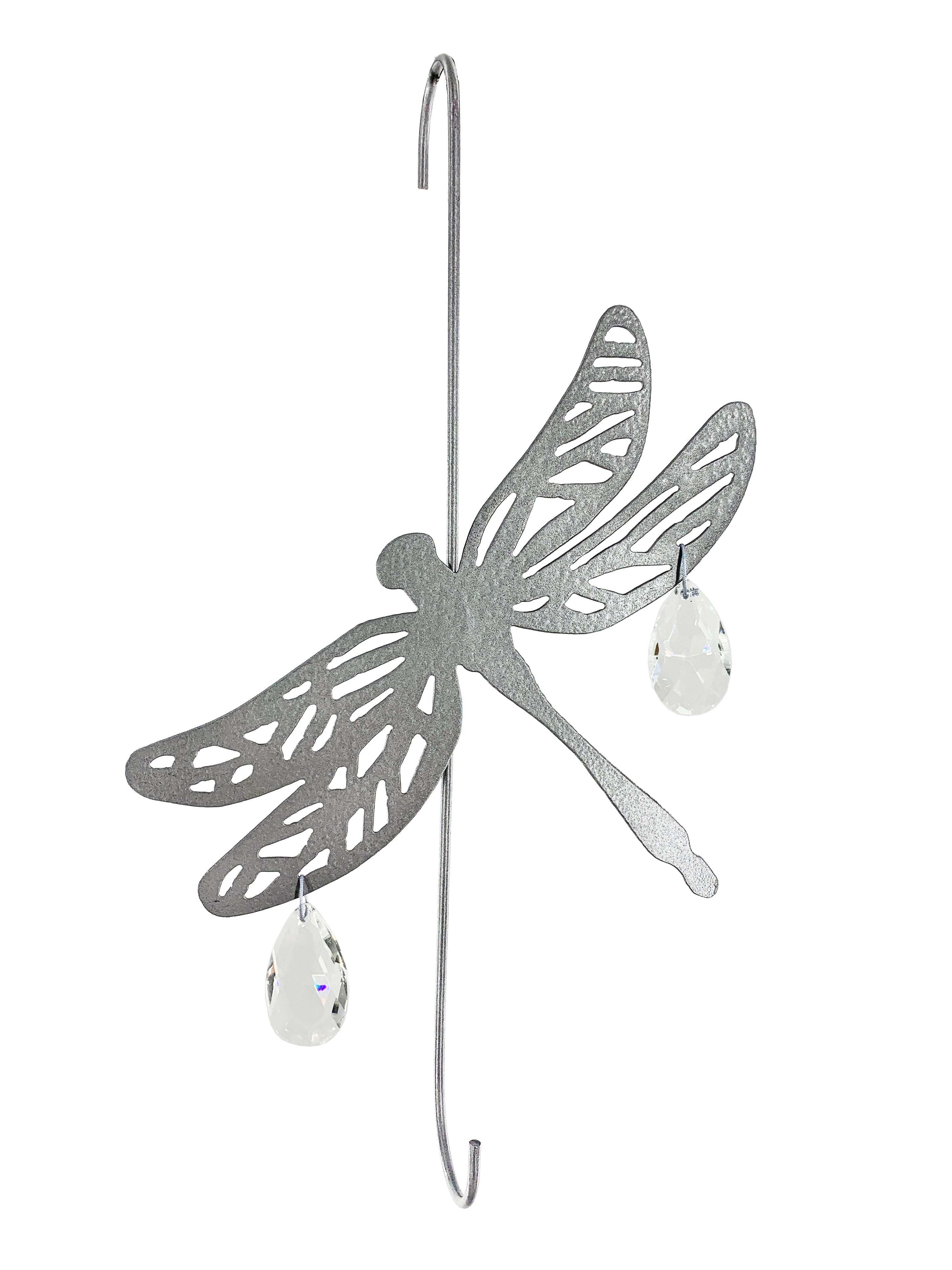 This extremely unique piece will make the perfect addition to a memorial garden. This lovely hook features a silver finish with two crystal teardrop prisms that shimmer and sparkle in the sunlight. The hanging hook measures 12 inches long. The metal dragonfly measures 6 inches wide by 5.5 inches tall.