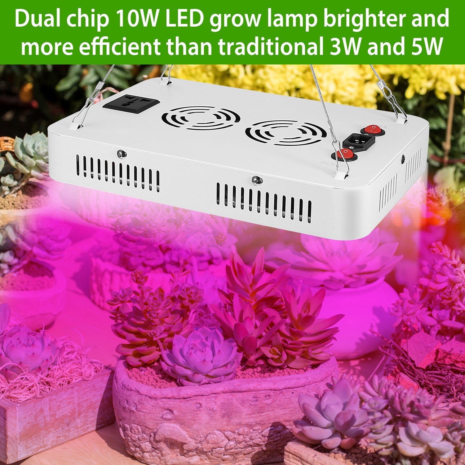 **Widely Use*:Made of high quality aluminum and PC materials,this light is rather sturdy and durable. Can be used to grow houseplants,vegetables,lettuce,tomatoes and herbs. Perfect for green houses. If you want better growing result,please turn to this LED grow light. Comes with hook,firm and stable,easy to install and use.