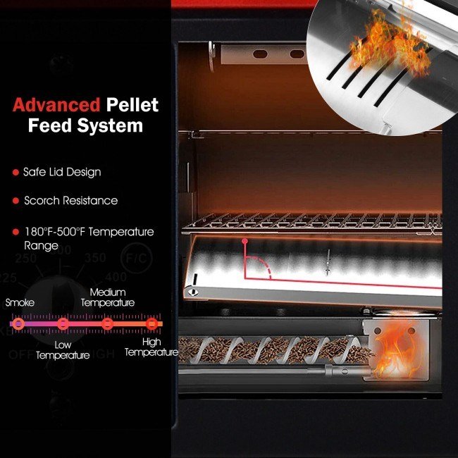 It has 256 sq.in cooking area for family of 4 to cook various ingredients. With this smoker grill, you can BBQ, bake, roast, braise, grill, smoke, sear and chargrill. Advanced pellet feed technology and built-in hopper ensure efficient heating. Besides, LCD screen and meat probe clearly show grill temperature and probe temperature. And you can also use the temperature control knob to adjust its temperature from 180°F to 500°F. What's more, compact size and stainless steel handle allow for convenient carrying. We also design it with grease bucket, anti-skid rubber foot pads, side hook and heat-resistant felt to bring more convenience.