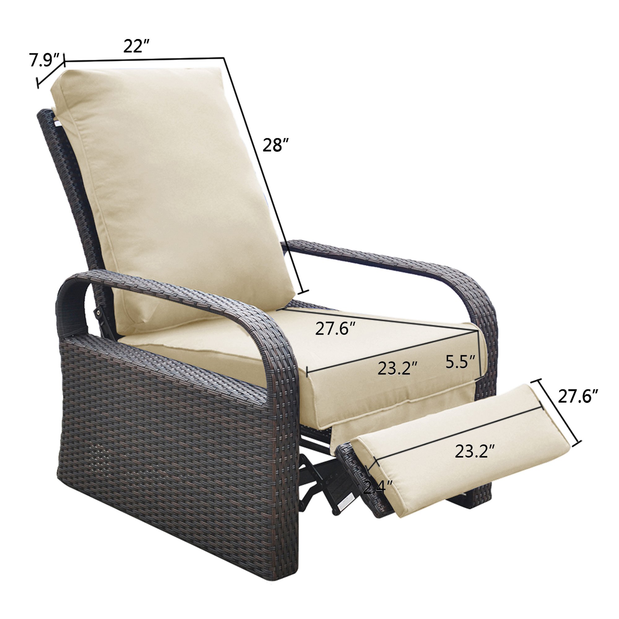 The  Outdoor Wicker Adjustable Reclining Lounge Chair with footrest adjusts to 3 different positions of your choice. The soft; padded cushions of the seat and leg rest allow you to sit or lie on the chair with your whole body comfortably relaxed.The sturdy aluminum frame is made of woven PE wicker to provide superior durability and stability and also cleaning convenience.
