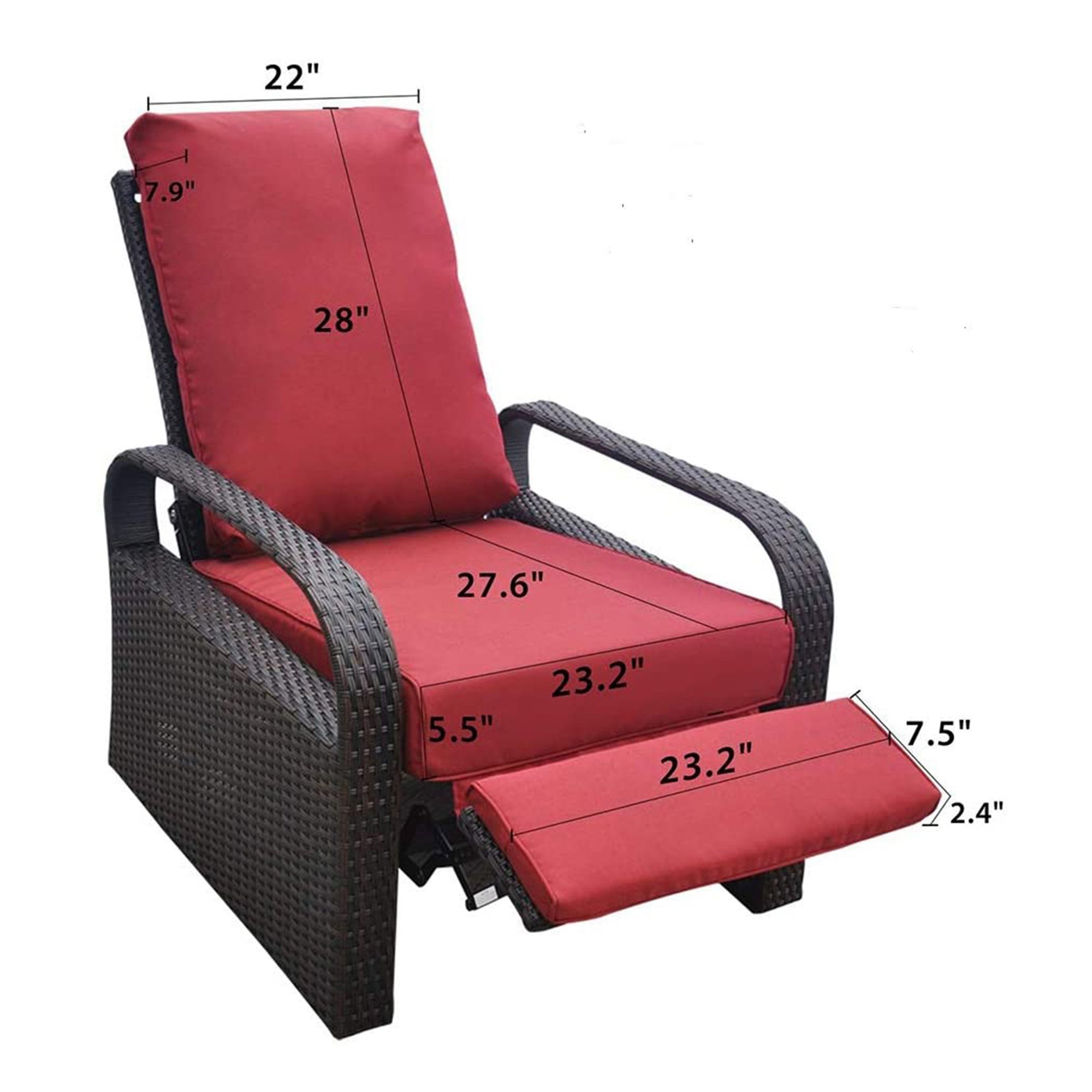 The  Outdoor Wicker Adjustable Reclining Lounge Chair with footrest adjusts to 3 different positions of your choice. The soft; padded cushions of the seat and leg rest allow you to sit or lie on the chair with your whole body comfortably relaxed.The sturdy aluminum frame is made of woven PE wicker to provide superior durability and stability and also cleaning convenience.
