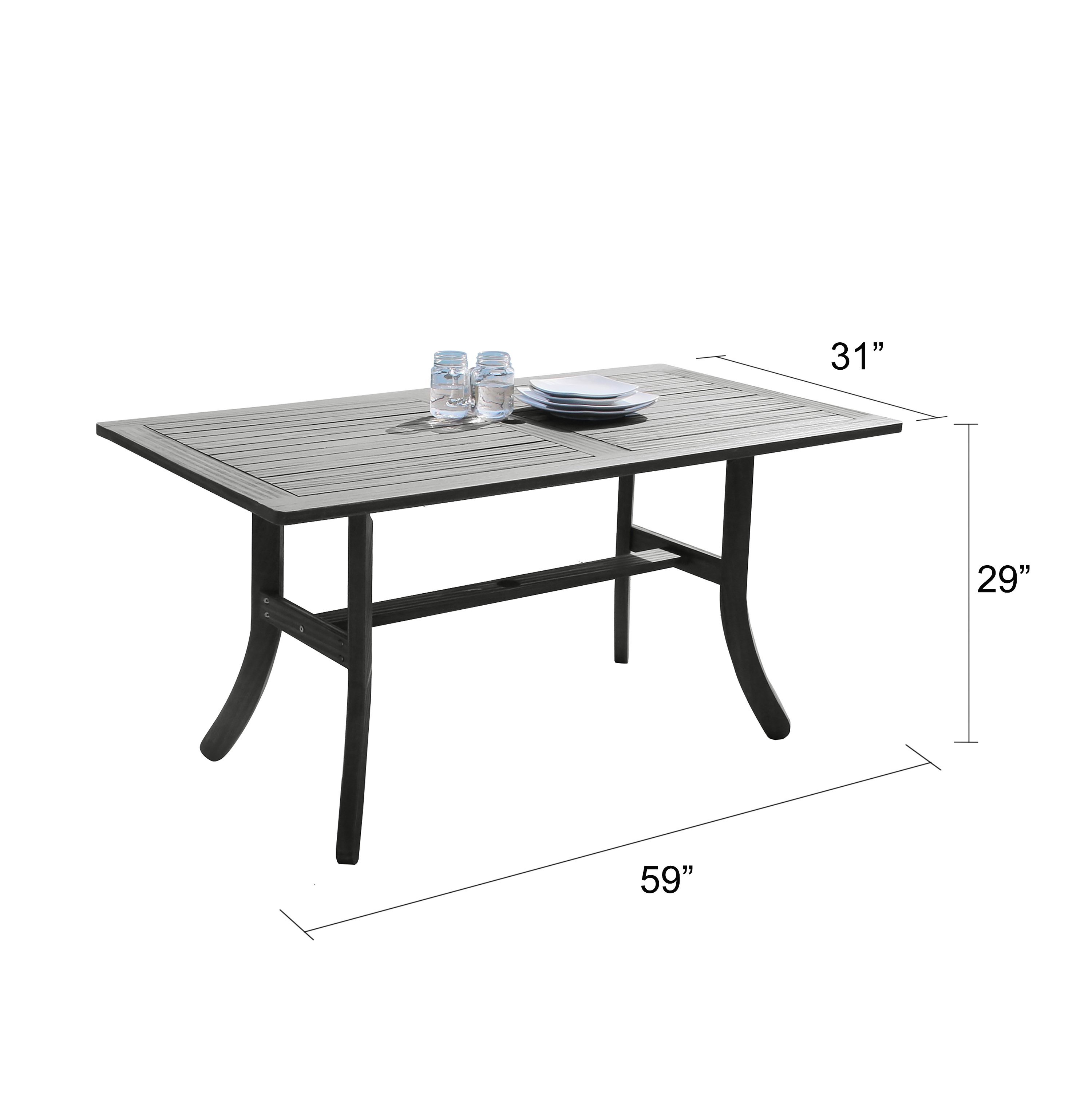 - Rectangular top; curve legs; with umbrella hole- Fast and easy to assemble- Made from Acacia Hardwood; Hand-scraped Wood Finish- Protective qualities: Weather-resistance; UV-radiation- Product dimensions: 59 L x 31 W x 29 H (inches)- Weight Capacity: 200 lbs